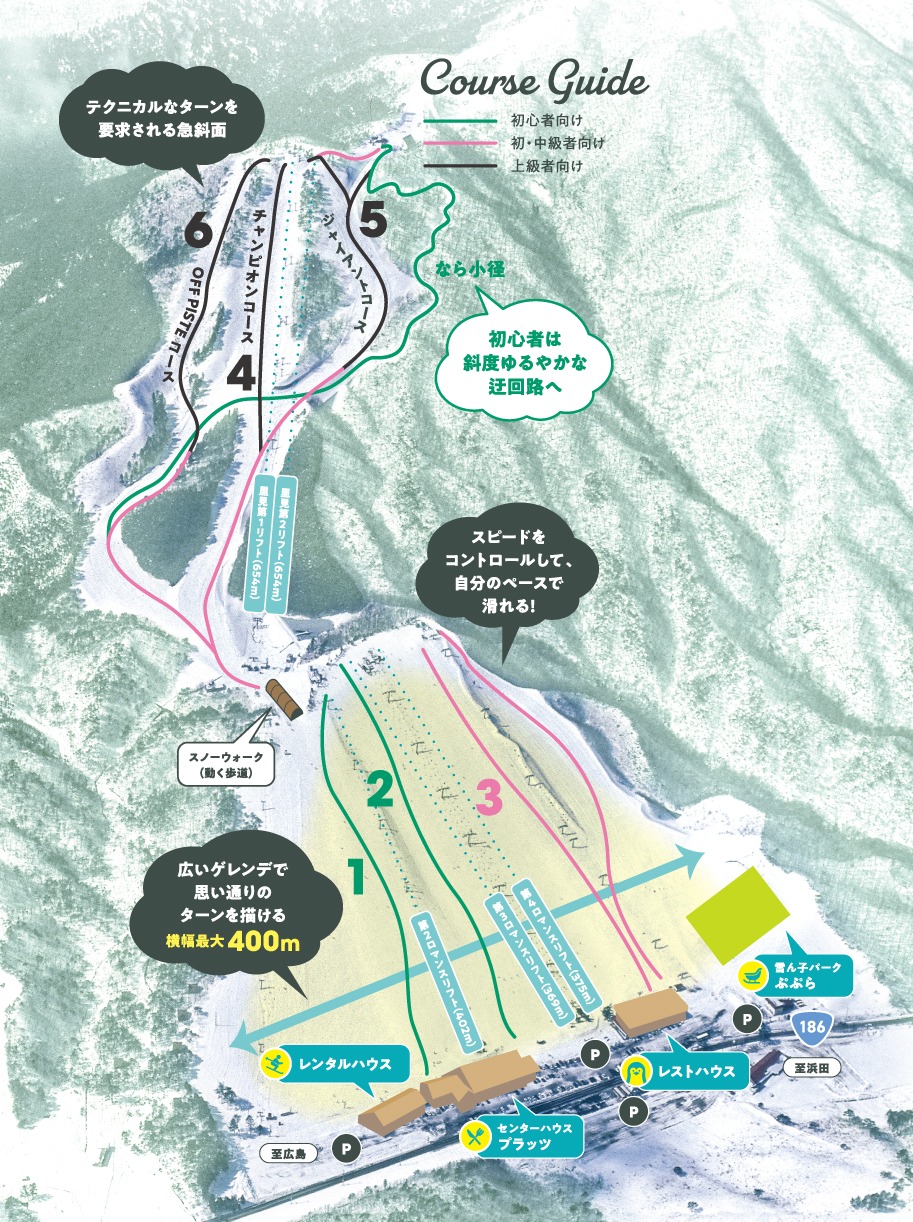 ビギナーも、ファミリーも楽しめる!すべりやすい・安全なひろびろコース!